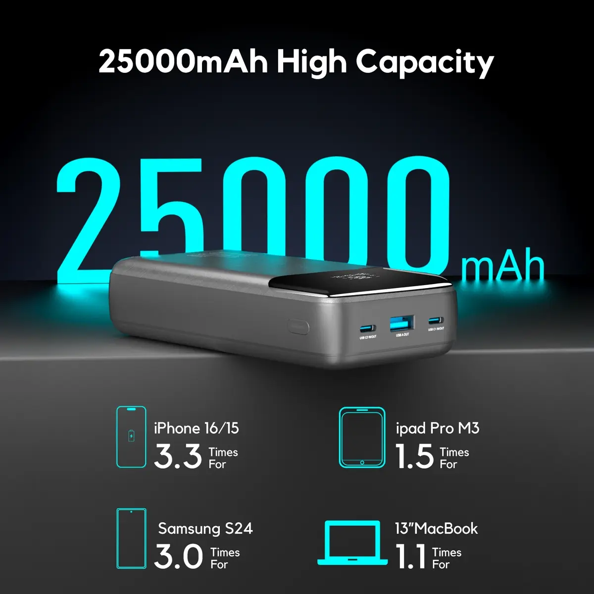 25,000mAh 2-in-1 fast charging power bank with 100W output charges devices in just 30 minutes.