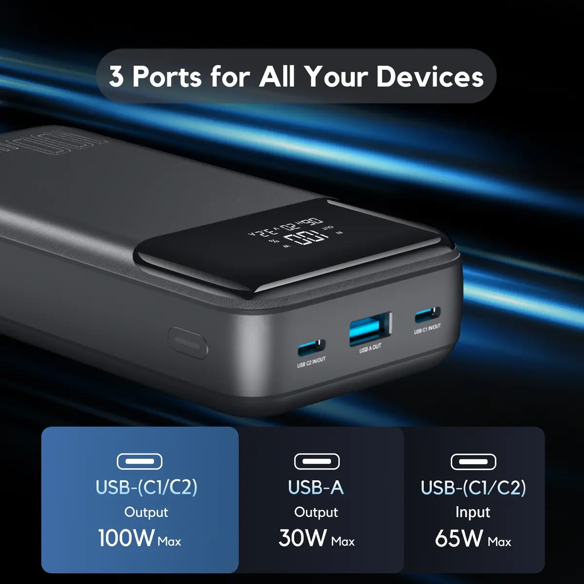 100W laptop power bank with a 25,000mAh capacity features a slim, compact design and three fast-charging ports to power up to three devices simultaneously on the go.