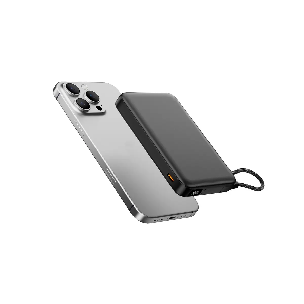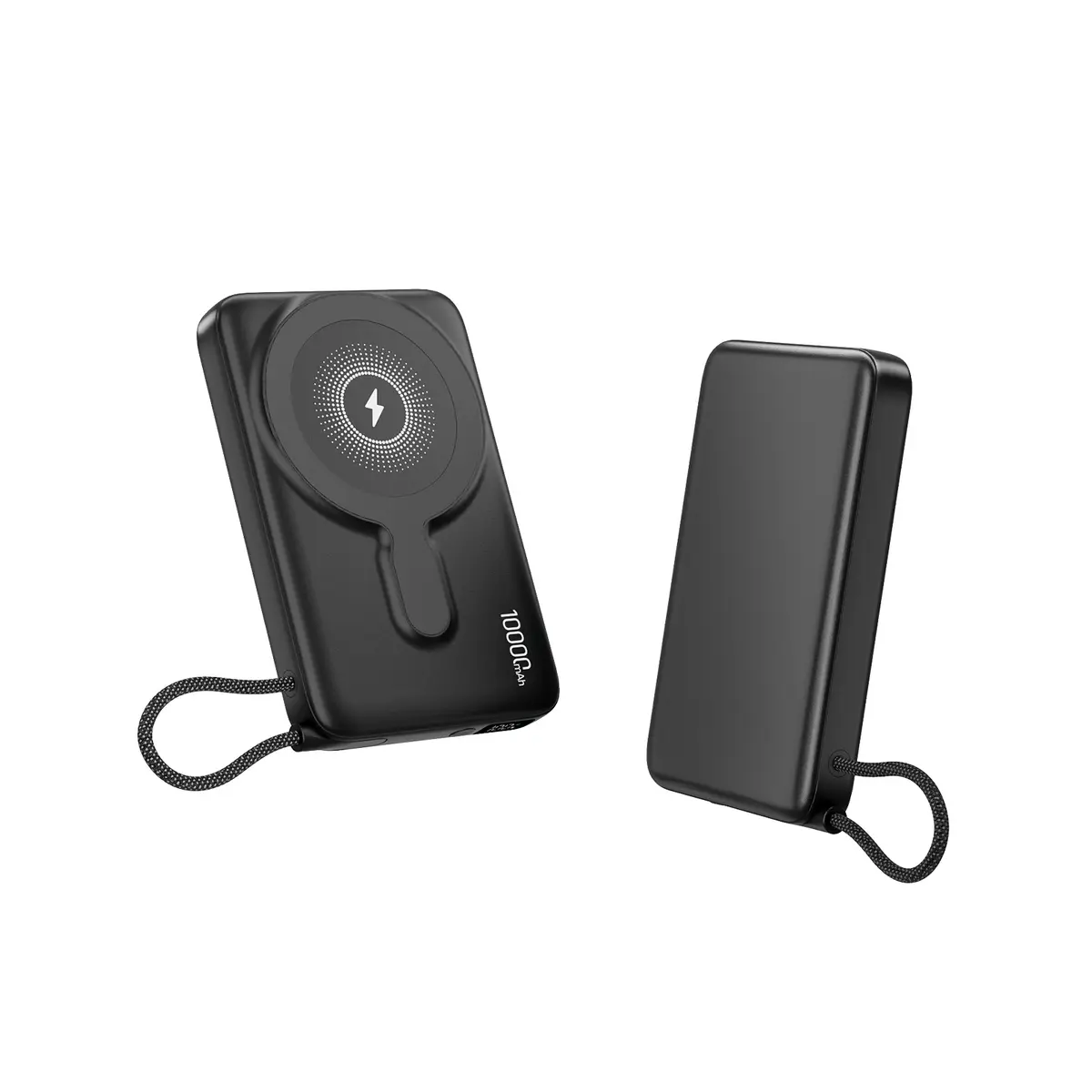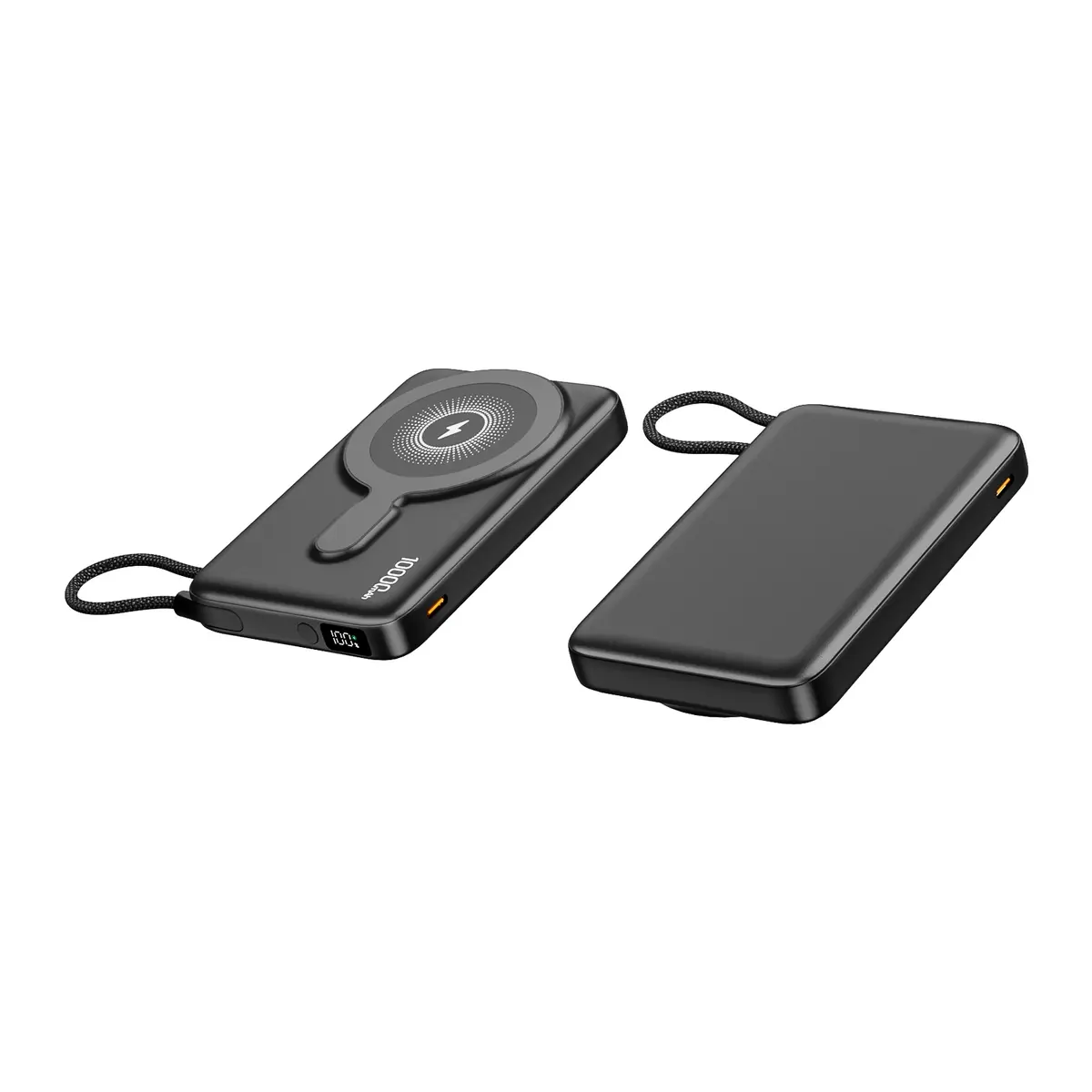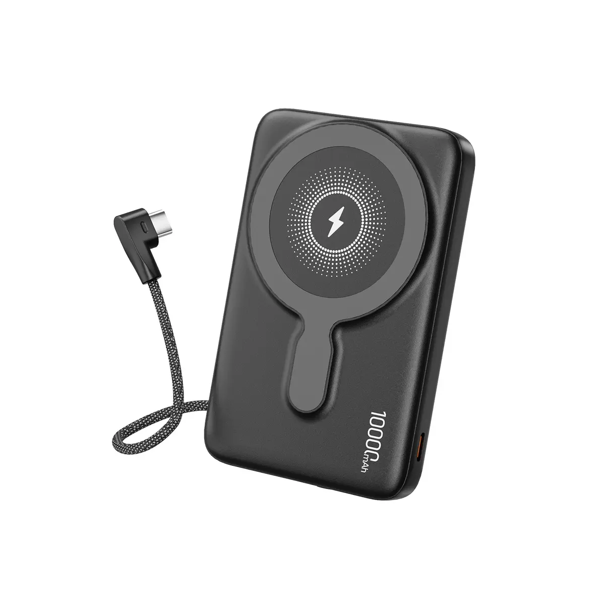 Built-in USB-C charging cable doubles as a strap loop
